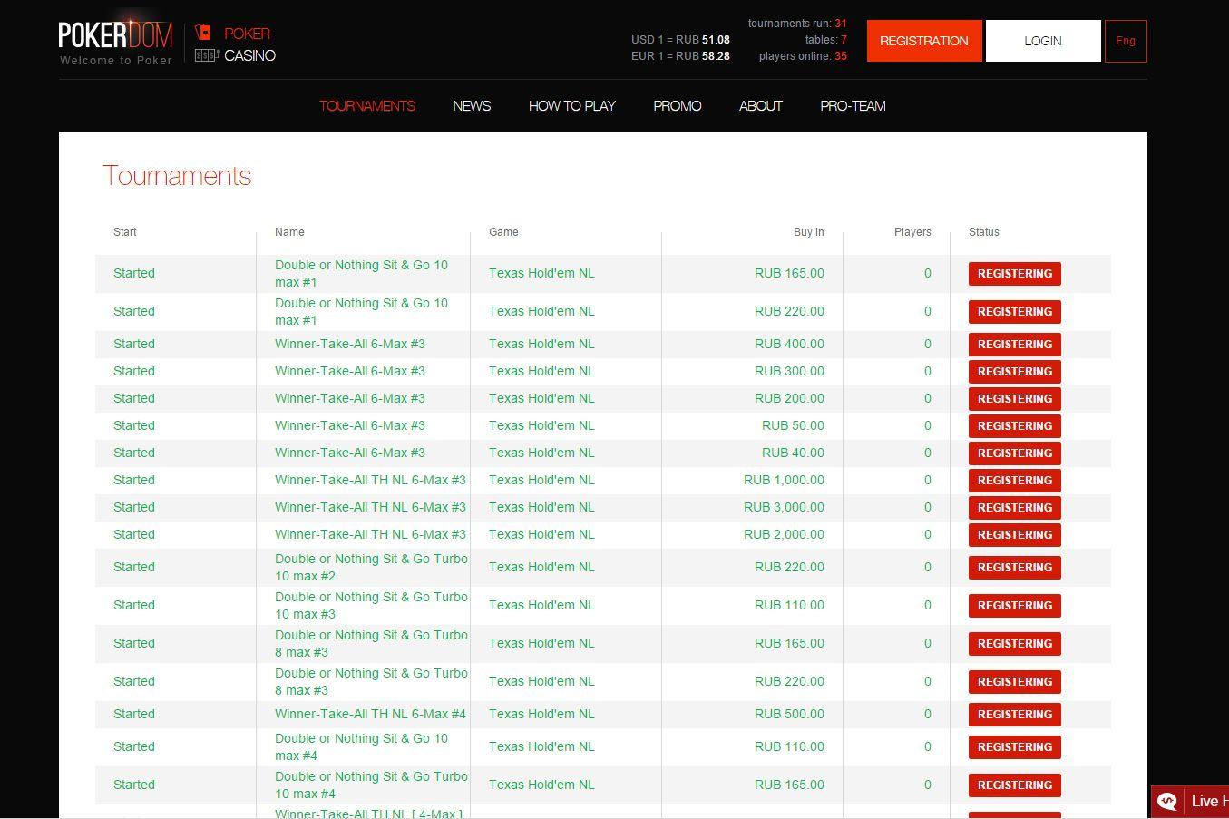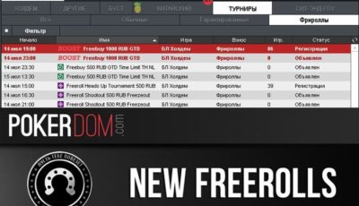 Главный фриролл ПокерДом проходит в одно и то же время: 21:00 по московскому времени по субботам. Обычные соревнования открываются каждые 5-6 часов, попасть в них может любой игрок, регистрация полностью открытая.